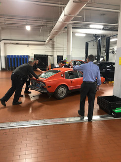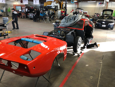 After the team in the shop was done with their initial repairs, the car made its way to the body shop. Andrew says that his biggest challenge was to find replacement parts for such a unique vehicle, down to every screw that had rusted that he needed to measure and order. The team at the body shop found parts from the one person in the country that sells them, and combined their knowledge to repair the rest of the parts that could not be found. They even found the original paint color code that would have been used on the car in 1972 and used that original color to restore the vehicle. In addition, the team at the body shop refinished the wheels, repaired all the fiberglass, and continued to work on the car.