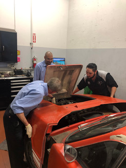 The first step was to bring down the car to the technicians so that they could determine all that needed to be done. It was here that Jason, Shop Foreman, discovered that the breaks no longer worked, so to say this was a treacherous task is an understatement. He parked the car in the shop corner for almost half a year, miraculously unbeknownst to David. This was unbelievable considering how difficult it is to hide things from David as he is always walking around to know everything that is going on, regardless of the department. Once the car was successfully in the shop, technicians filled the tires with air and they held, which showed positive signs for the project at hand. However, Andrew remarks the feeling of continuing to examine the car and realizing the “monumental” amount of work to be done if the team wanted to deliver a finished product they were proud of. This project was already daunting, and it was made even more difficult by two things: 1. how to keep costs down without sacrificing quality, and 2. how to do this when restoring such an old car with only ~8,300 models of it produced.